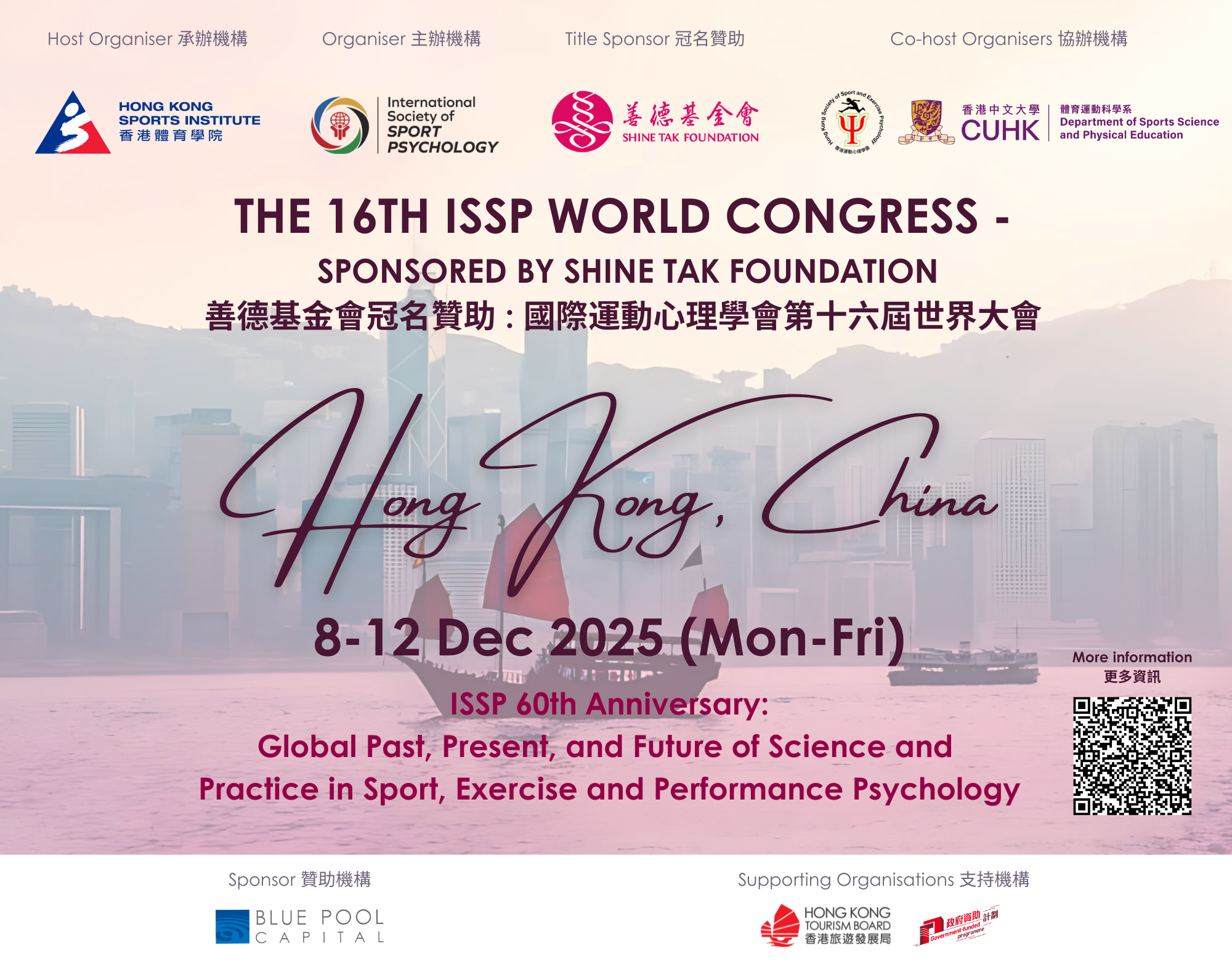 You are cordially invited to join The 16th ISSP World Congress - Sponsored by Shine Tak Foundation hosted by the Hong Kong Sports Institute (HKSI).