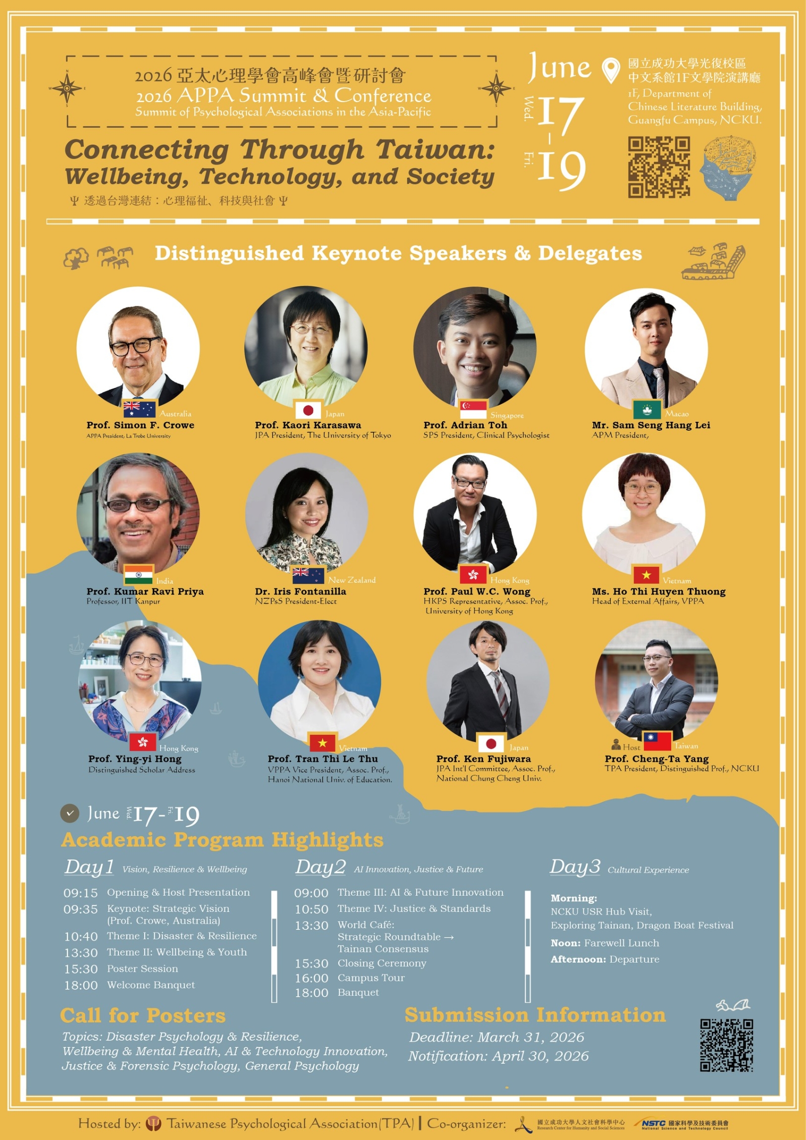On behalf of the Taiwanese Psychological Association (TPA), we cordially invite you and your members to the 2026 Summit of Psychological Associations in the Asia-Pacific (APPA).